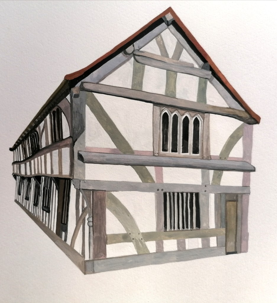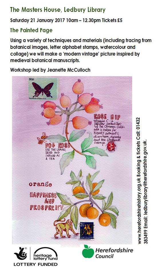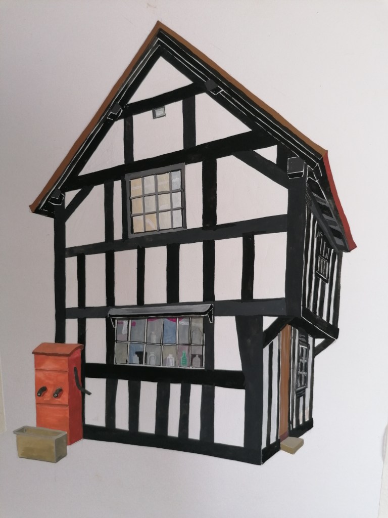 A commission through West Midlands Railways funded by the Department of Transport, for an illustrated map at Ledbury Railway Station has been given to three artists in Ledbury. Caroline Owen-Thomas who is a local calligrapher, Cheryl Davies who is an illustrator and myself, are making paintings, drawings and calligraphic text, working with Gareth Davies who worked with rail authorities to put together this project. The map will celebrate this historic market town, rich in Tudor timbered buildings and a High Street full of examples of Elizabethan and Georgian architecture. Here are two examples of recent paintings Jeanette has made for her contribution to this project.