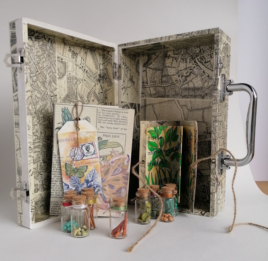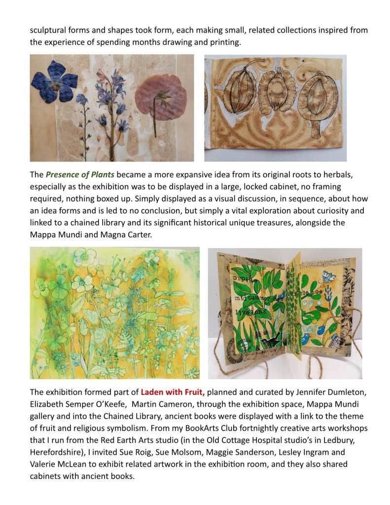 The exhibition is entitled ‘Laden With Fruit’ and as well as my work features the work of 5 other artists who have been participating for 18 months in a fortnightly BookArts Club that I facilitate in my Red Earth Arts studio (Sue Roig, Sue Molsom, Lesley Ingram, Maggie Sanderson, Valerie McLean and Ann Davies). Specific rare and relevant books from the Chained Library collection will be displayed with the artists work. The exhibition is in Hereford Cathedral Chained Library (entrance is £6) and runs from the 9th October 18th December 2023. Work is still in progress, but it’s a wonderful time to branch out into new avenues.