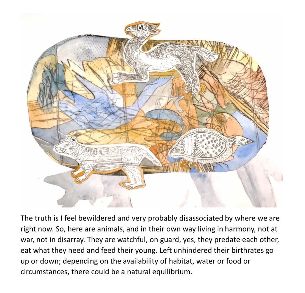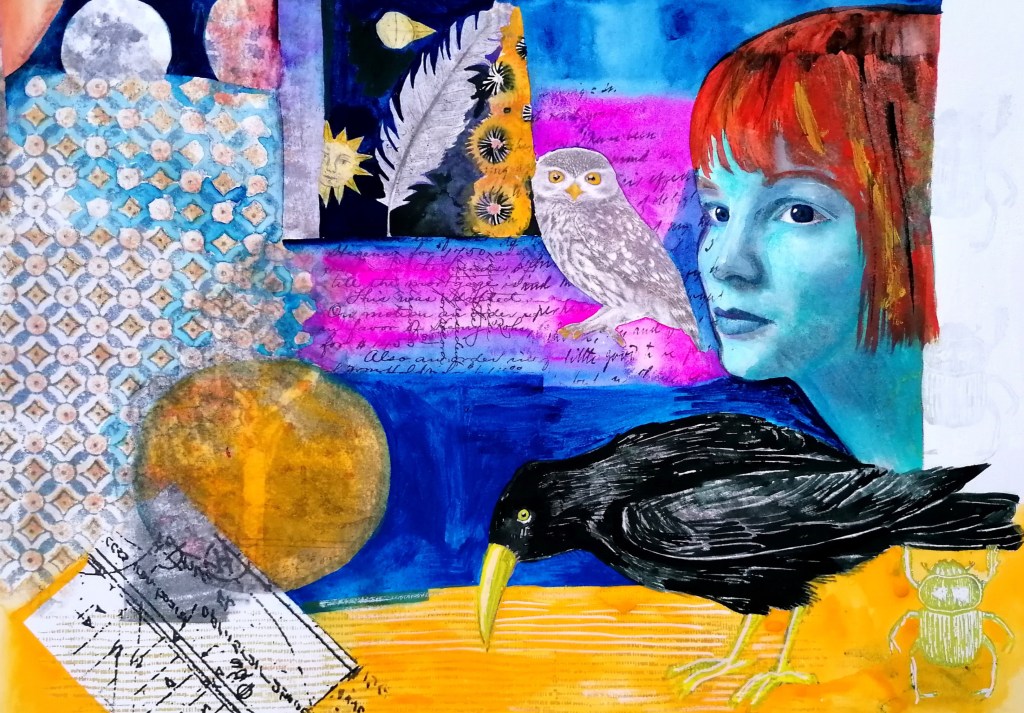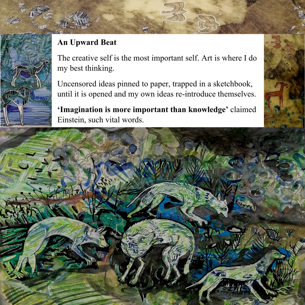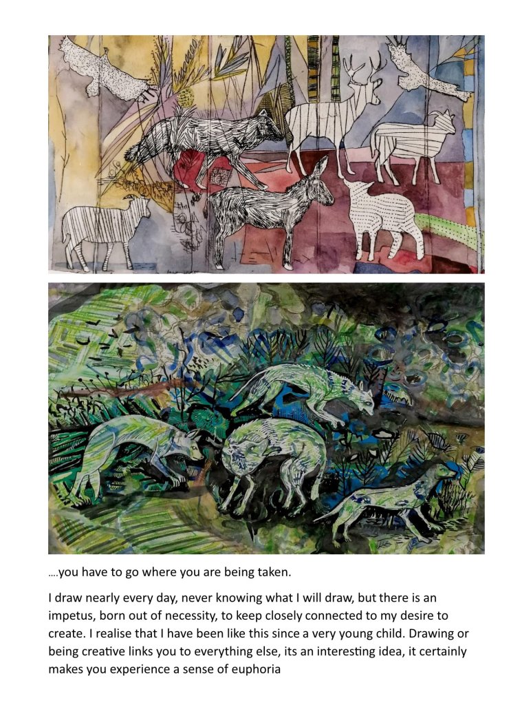 Woven into these new paintings and illustrations are a curious selection of images that pull together to then tug apart and re-configure. Because there is a fundamental interconnectivity to the themes in my work, I observe that art might bind people to place and each other. Thinking about other exhibited or published work, for example two previous Arts Council England grants, for ‘Art Cases’ and ‘Travelling by Moonlight’, exhibitions I have curated and exhibited in group and individual shows, I continually tap into my understanding that all things are interwoven and joined.