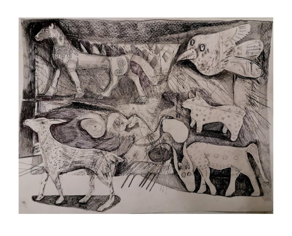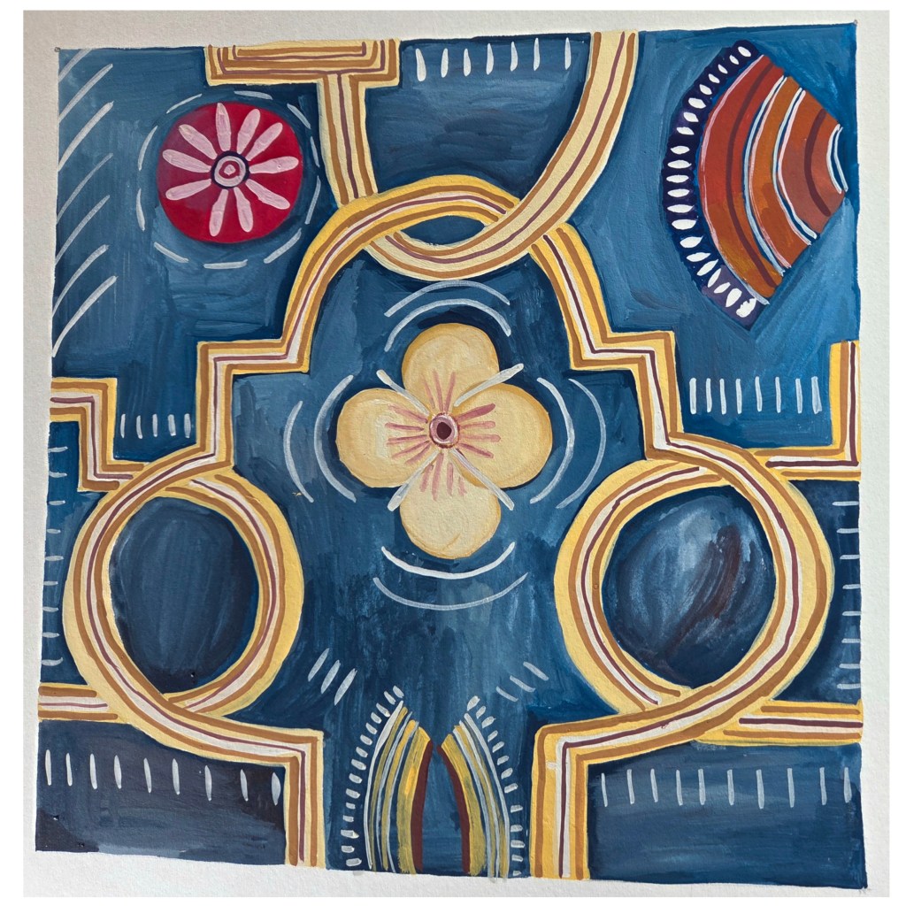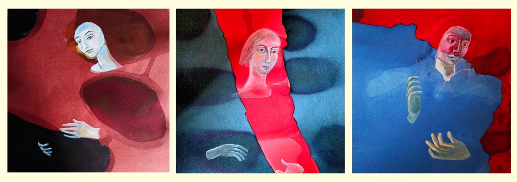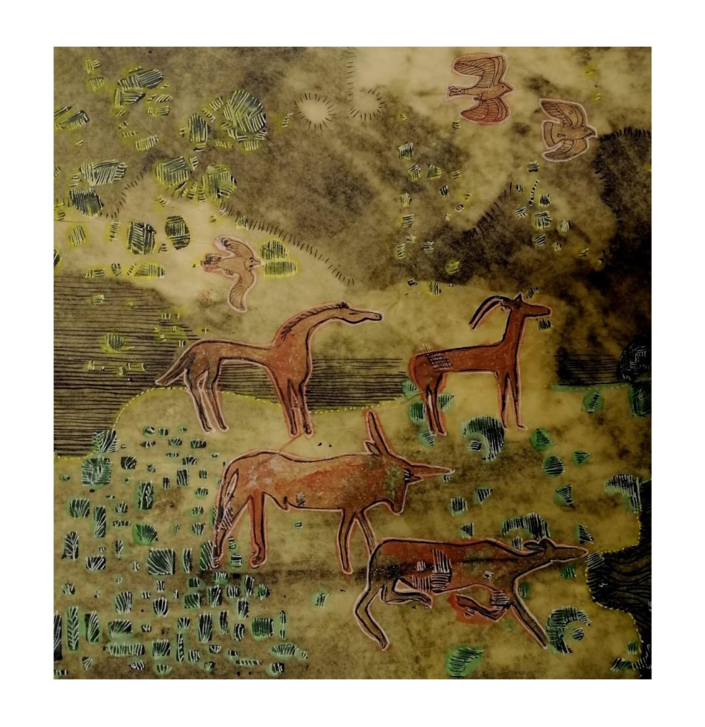 Woven into these new paintings and illustrations are a curious selection of images that pull together to then tug apart and re-configure. Because there is a fundamental interconnectivity to the themes in my work, I observe that art might bind people to place and each other. Thinking about other exhibited or published work, for example two previous Arts Council England grants, for ‘Art Cases’ and ‘Travelling by Moonlight’, exhibitions I have curated and exhibited in group and individual shows, I continually tap into my understanding that all things are interwoven and joined.