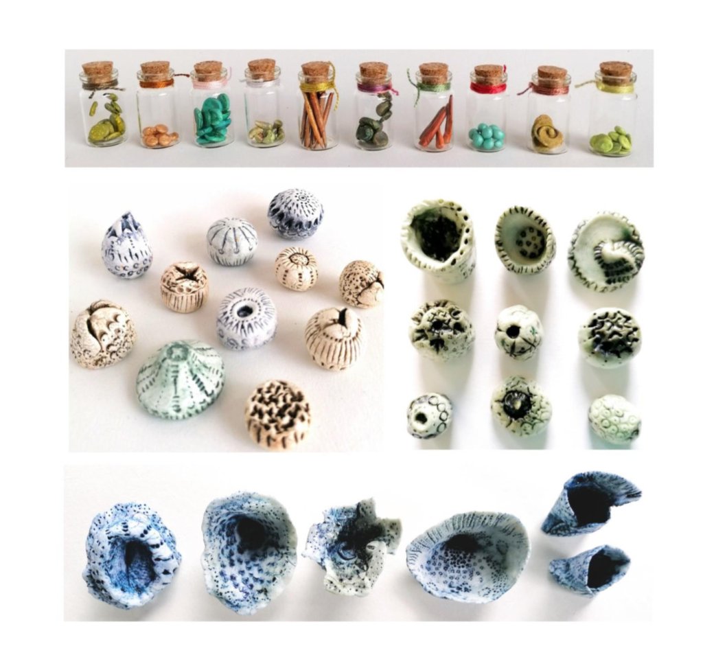 This strange preoccupation with plant forms, pushed me further into drawing initially seeds pods and plant details, but then diving into using porcelain and paper clay. Although ‘herbals’ had been a trigger, the resulting work became an idea for an installation in the chained library in a cabinet….