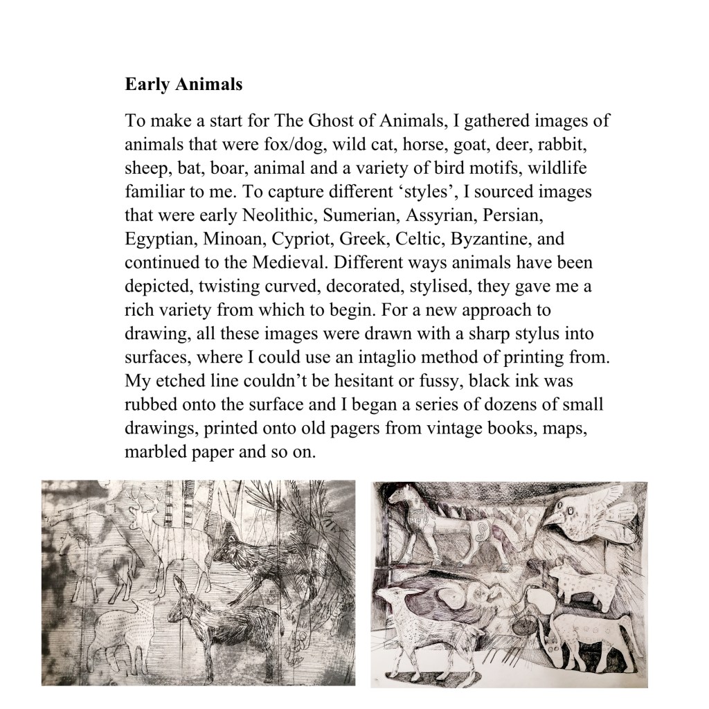 I visited several times, sitting studying very old books, drawing in pencil. This led me to begin making a series of small handmade illustrated books, creating my own images, often working on paper treated to create unusual backgrounds.