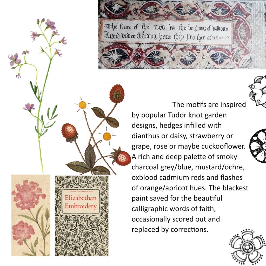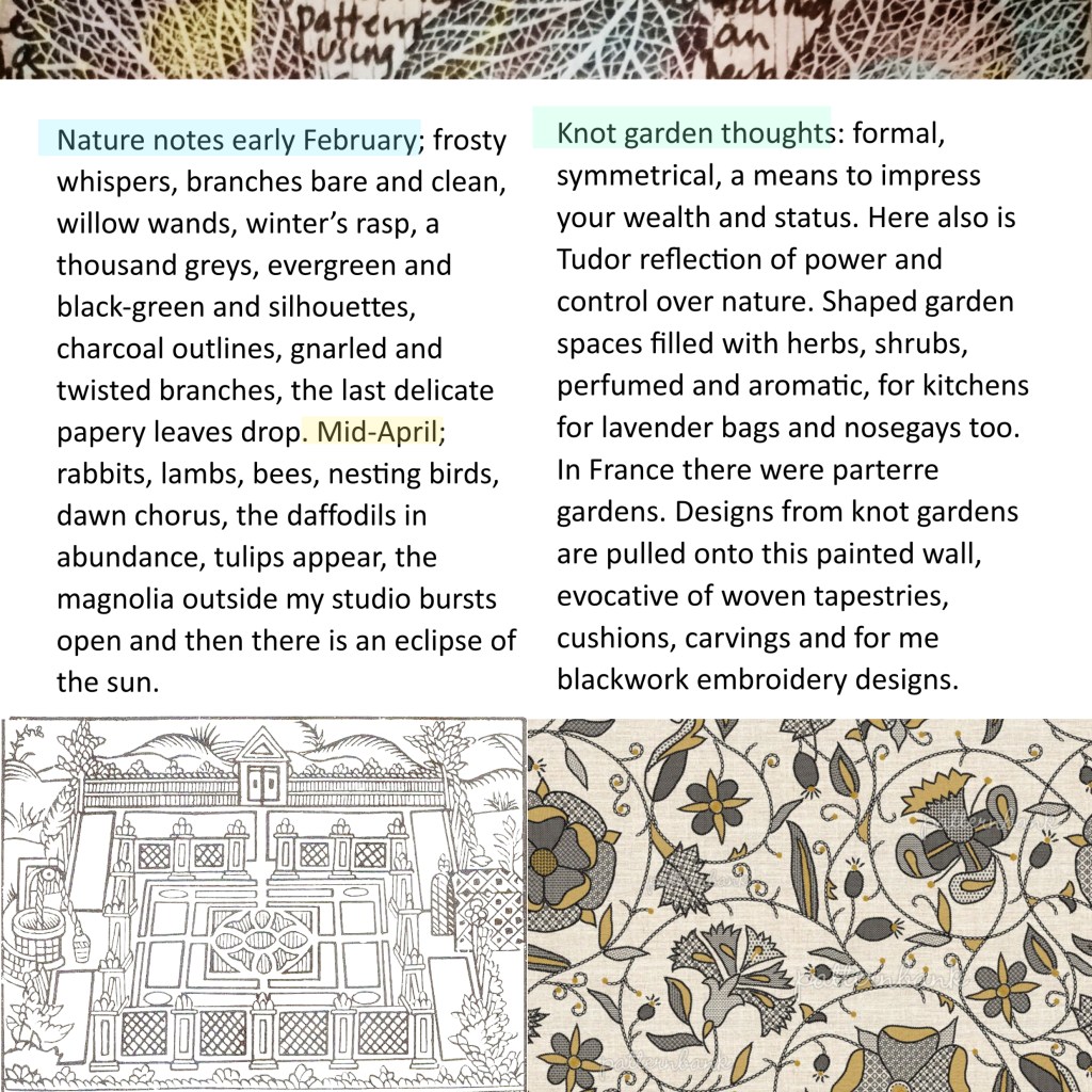 This recent Kilpeck artwork has shifted since the previous Knotworks exhibitions, and the initial art made some years ago, made in response to Kilpeck Church (and other Herefordshire Romanesque churches) and Graham’s poems, a series of ten fine silk panels (becoming the skin of a church and its wall paintings). The colours have changed and there is a different weight. Making art is a building process, of scratching in then removing, or layering then revealing and concealing.
